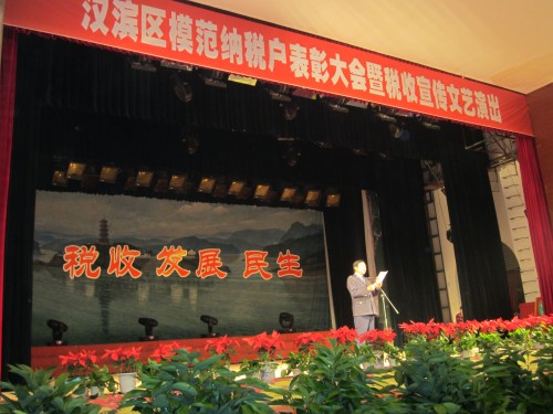 4月23日,張龍寶董事長代表寶業(yè)(集團)公司參加“漢濱區(qū)模范納稅戶表彰大會暨稅收宣傳文藝演出。